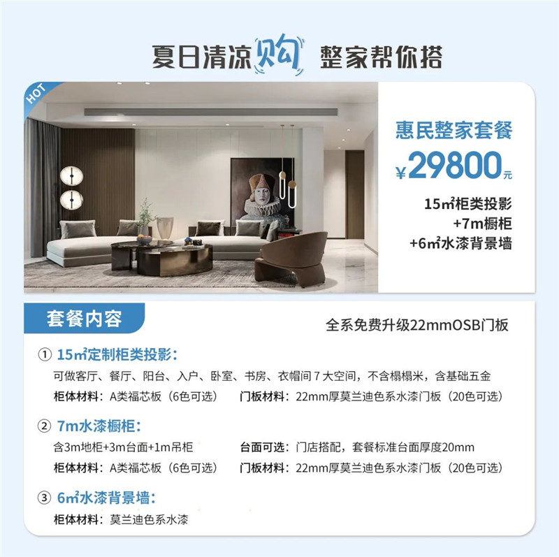 2023年6月30日-8月20日,350vip浦京集团年中大促带来惠民整家套餐¥29800,甄选水漆福芯板并严格遵守国家环保等级标准,打造高性价比的健康环保整家。