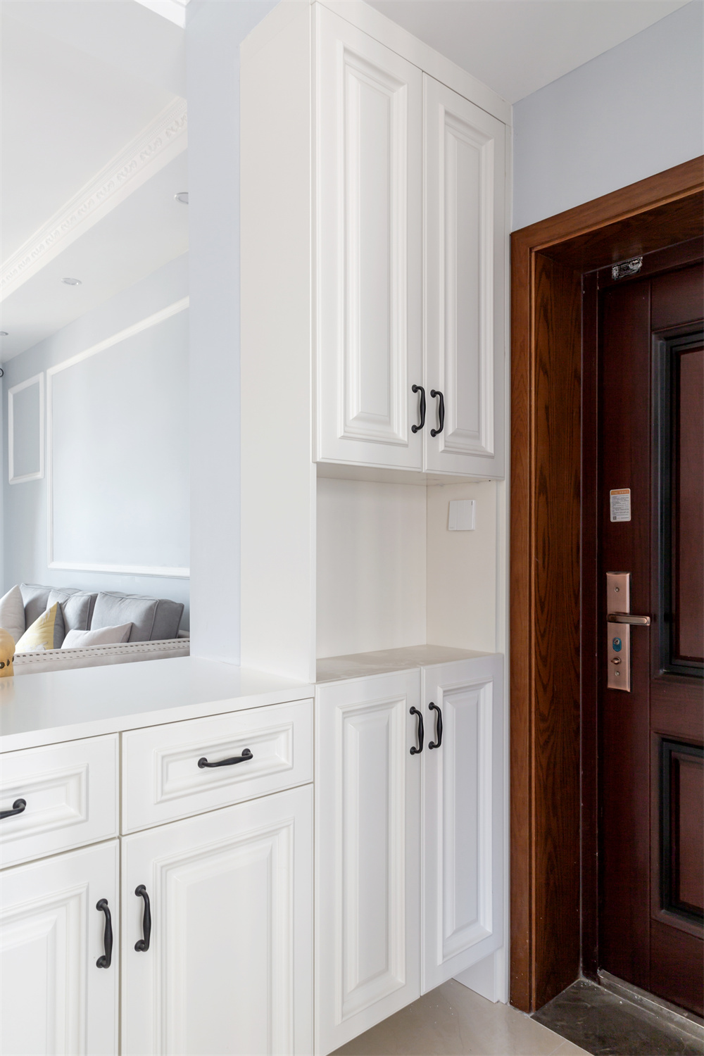 从进门处映入眼帘的是整体芬兰白的玄关柜,屋主选择做了L型的玄关柜。延伸出类似于吧台的设计,在视觉上与客厅处相连接,同时放大玄关处的空间感。