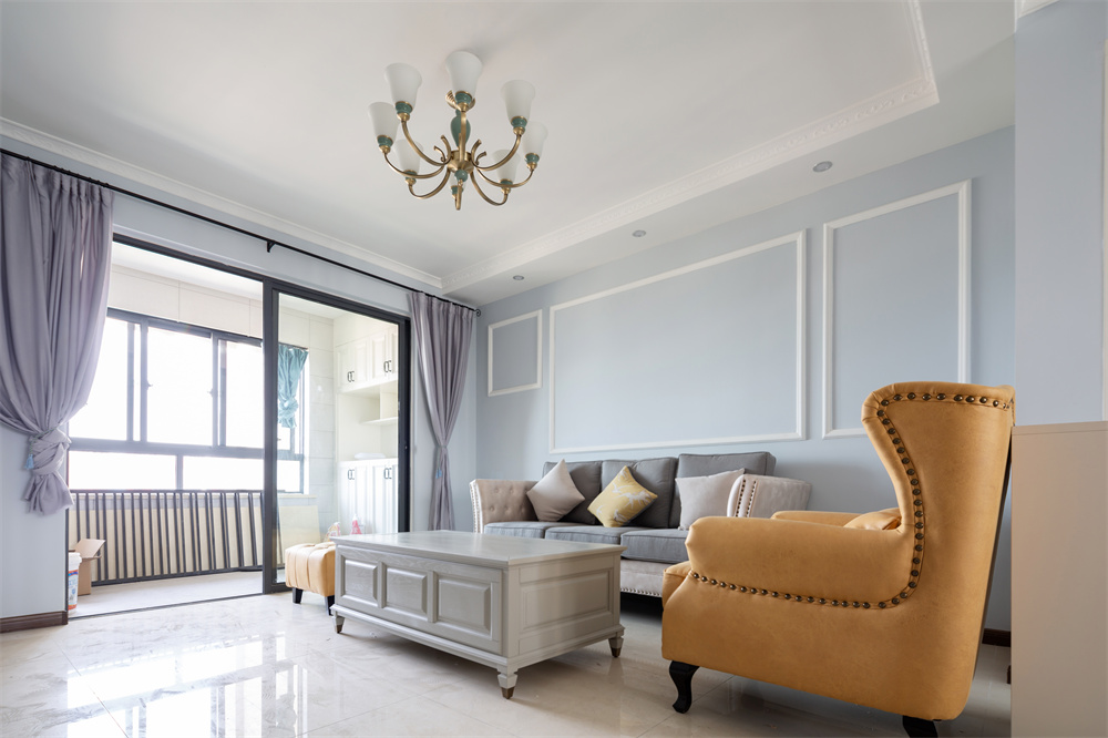 客厅处能够真正体现出北欧风情。以蓝白为主要色调,搭配白色吊灯,在灯光与颜色的搭配下凸显温馨的感觉。沙发背景墙上带有三个不同大小的长方形的图案,为客厅处增加生机活力。橘黄色沙发为客厅处增添一抹亮色,可以很好调节客厅内的氛围。