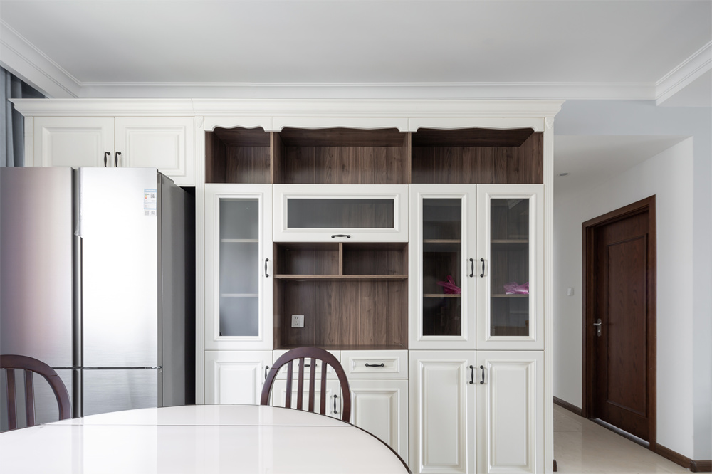 收纳柜的顶部做了延长设计,便于冰箱的嵌入式摆放,可以节省冰箱占据的空间。白色柜身与中雅胡桃色里面的相互搭配,透露出一股静谧典雅的感觉。柜身按照不同摆放需求,顶部可以放置许久不用的东西,中间部分放置杯子、书本这种日常随手可以用的物品,下方可以放置一些榨汁机、暖瓶、烧水壶等物品。