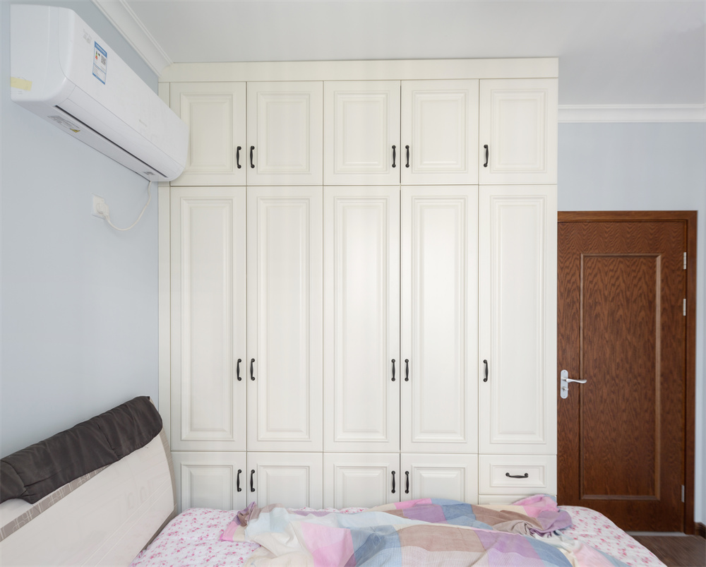屋主在卧室内做了内嵌衣帽间的设计,屋主在衣帽间柜体的选择上采用整体性原则,统一选用芬兰白的柜体。这个衣帽间采用开放性的设计,转角衣杆在接缝处没有突出的部分,稳定且承重能力强。