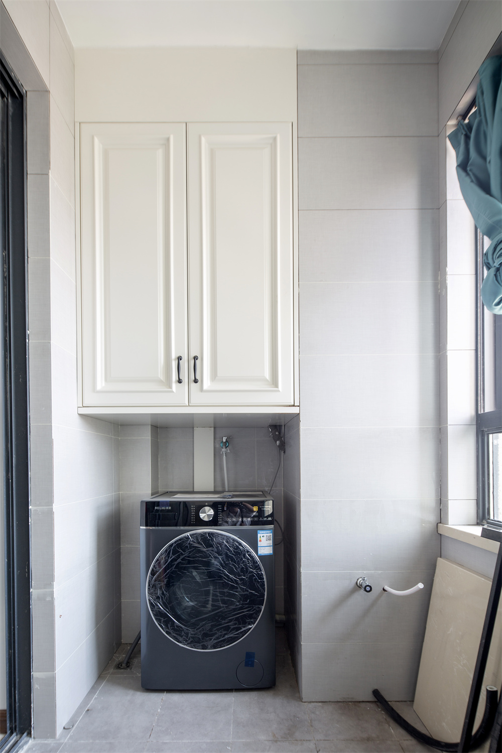 朝南的阳台可以在太阳升起时,感受来自清晨的第一缕阳光,芬兰白整面到顶阳台柜的设计,可以放置衣架以及冬天的鞋子。中间镂空部分加做了三个空格,给收纳增加了额外的空间。