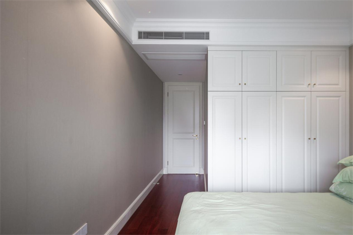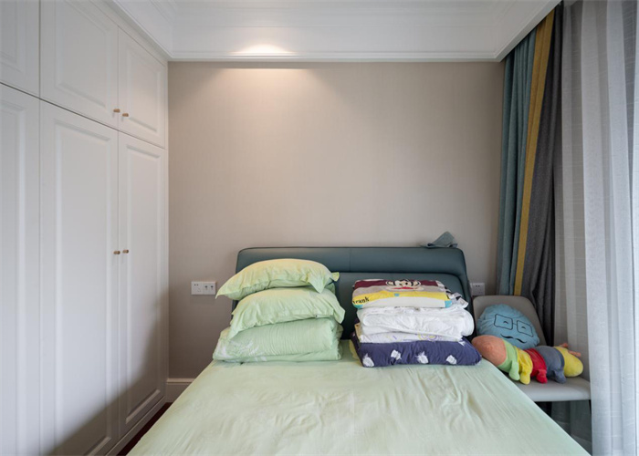 次卧与阳台相连接,使得整体的光线更加透亮,实现了在早晨起来便能感受到来自外界的第一缕光亮。与主卧处颜色搭配相反,床铺使用的是相应的淡绿色,背景墙采用的是棕色。一侧整面到顶的衣柜,两开门的衣柜设计,精美的膜压门板花纹,给空间增添一丝层次感。金色的立体把手减少了拉开门时的阻力。在打造的时候要注意衣柜与床铺之间的距离,避免拉开的时候与床边相碰撞。