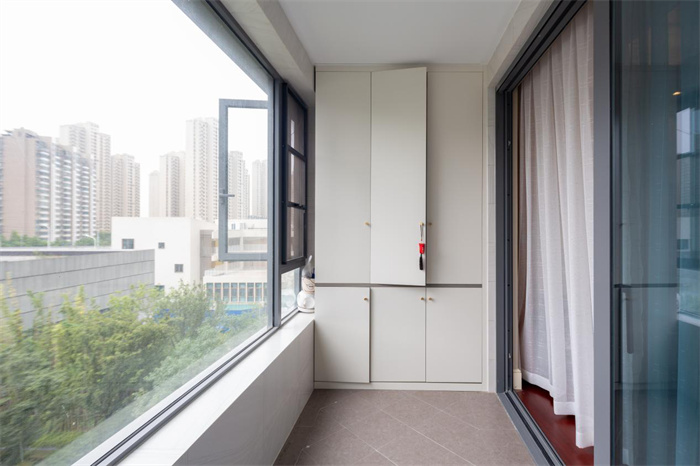 通过阳台可以看见窗外郁郁葱葱的树木,小区的居住环境优美,安静宜人。阳台呈现狭长的形状,一侧为洗衣机柜,根据两个洗衣机的高度比例进行打造,上方较高的柜体放置一些洗涤用的杂物,下方放一些衣架便于拿取。洗衣机柜与餐边柜为同样的门板颜色和把手形状,打造起来比较省心。