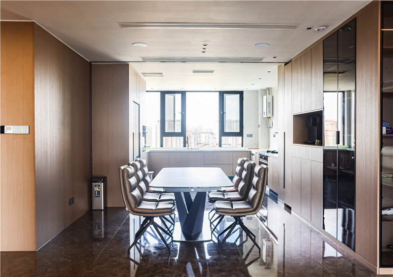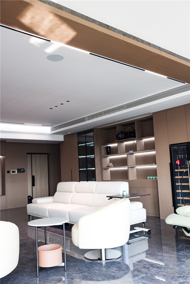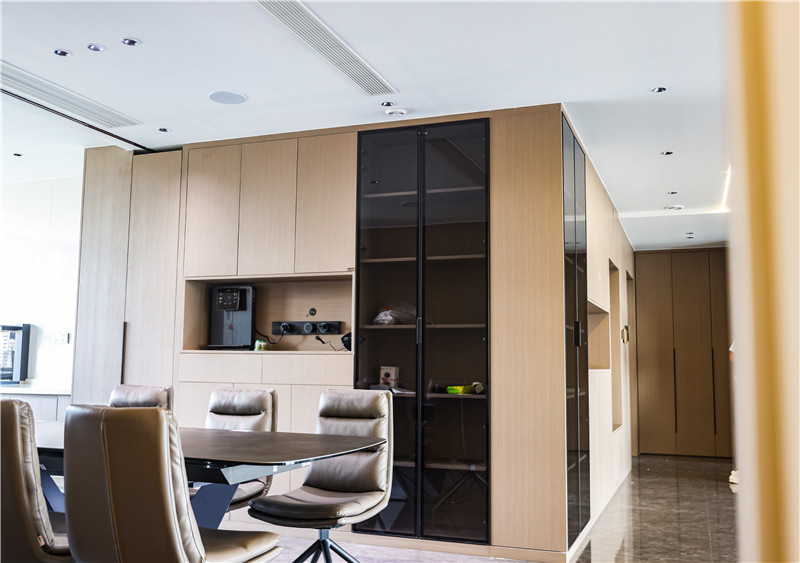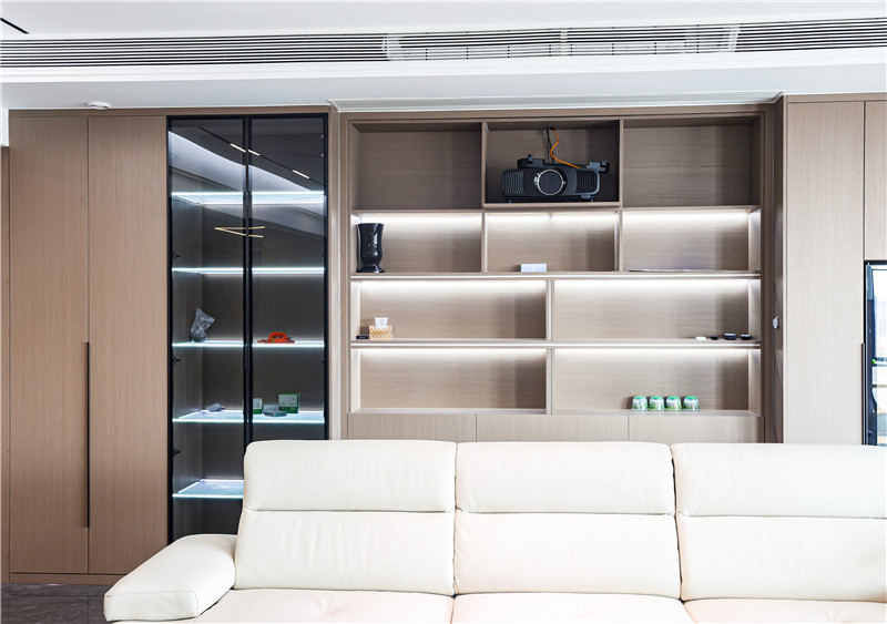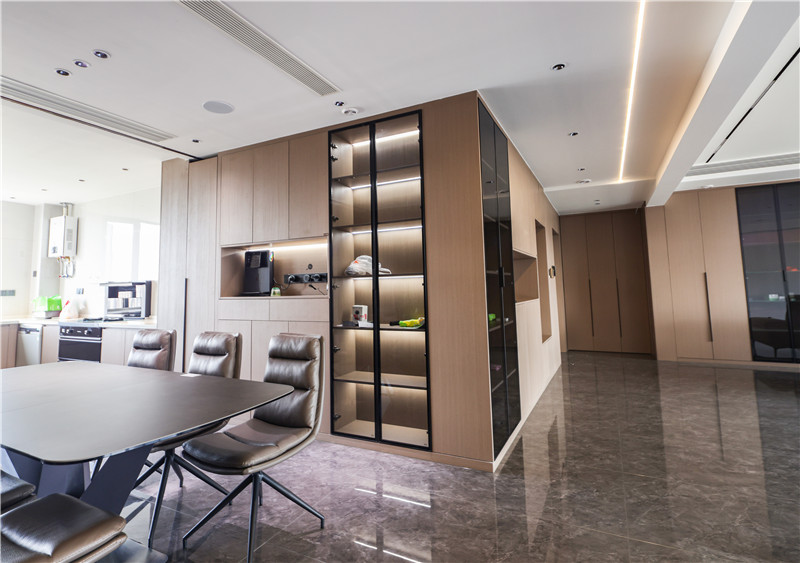 全屋选用科技直纹与莫兰迪系列,工艺的运用凸显木质纹理的高档家具材质;整体门墙柜一体化设计,视觉上和谐统一;藏露相宜的一柜到顶式收纳柜将酒柜内嵌,合理增加使用功能又不占空间;黑玻与灯带的搭配在原木风基础上增添“低调的奢华”。