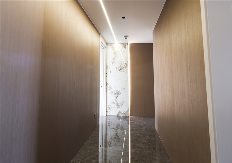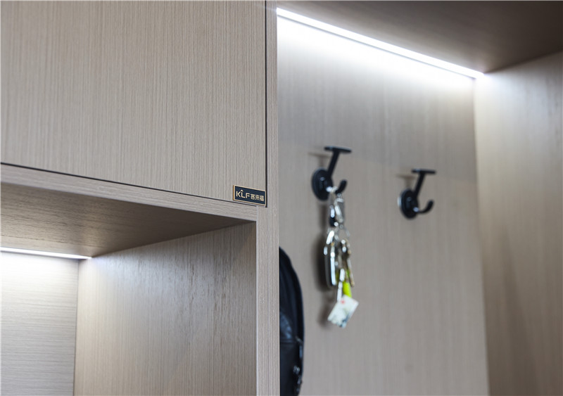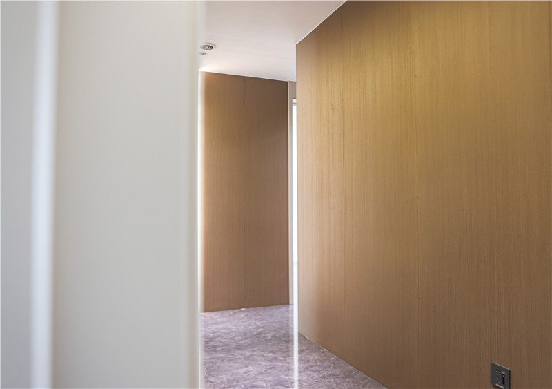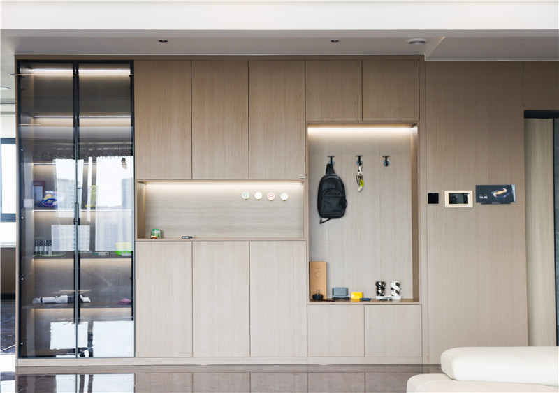 玄关柜与走道遵从着门墙柜一体化设计,选用客厅柜同种板材强调着整体的统一;在大面积的原木色使用下、在自然木质纹理呈现下,带给家居温暖与平静。