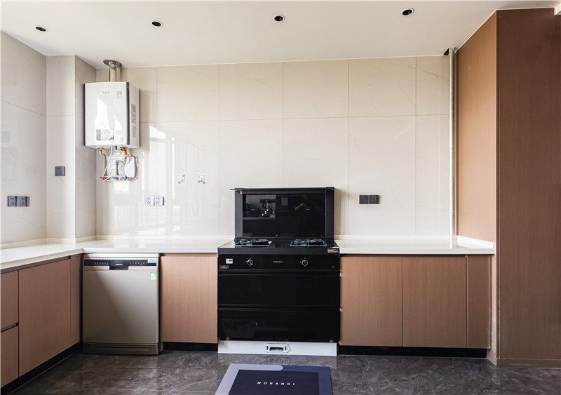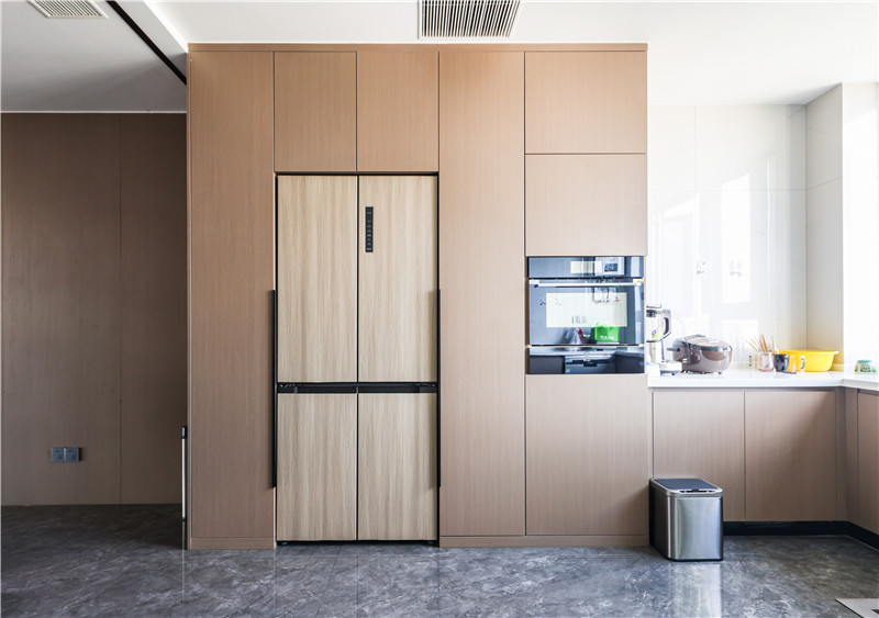 餐厨一体化设计,增强家人用餐的互动;U型设计将橱柜与餐边柜结合,增强收纳功能;统一的原木风餐边柜与橱柜,营造柔和、舒适的感觉;原木色是温暖明亮的颜色,用在餐厨处,打磨岁月安宁感,静静享受美食别有一番风味。