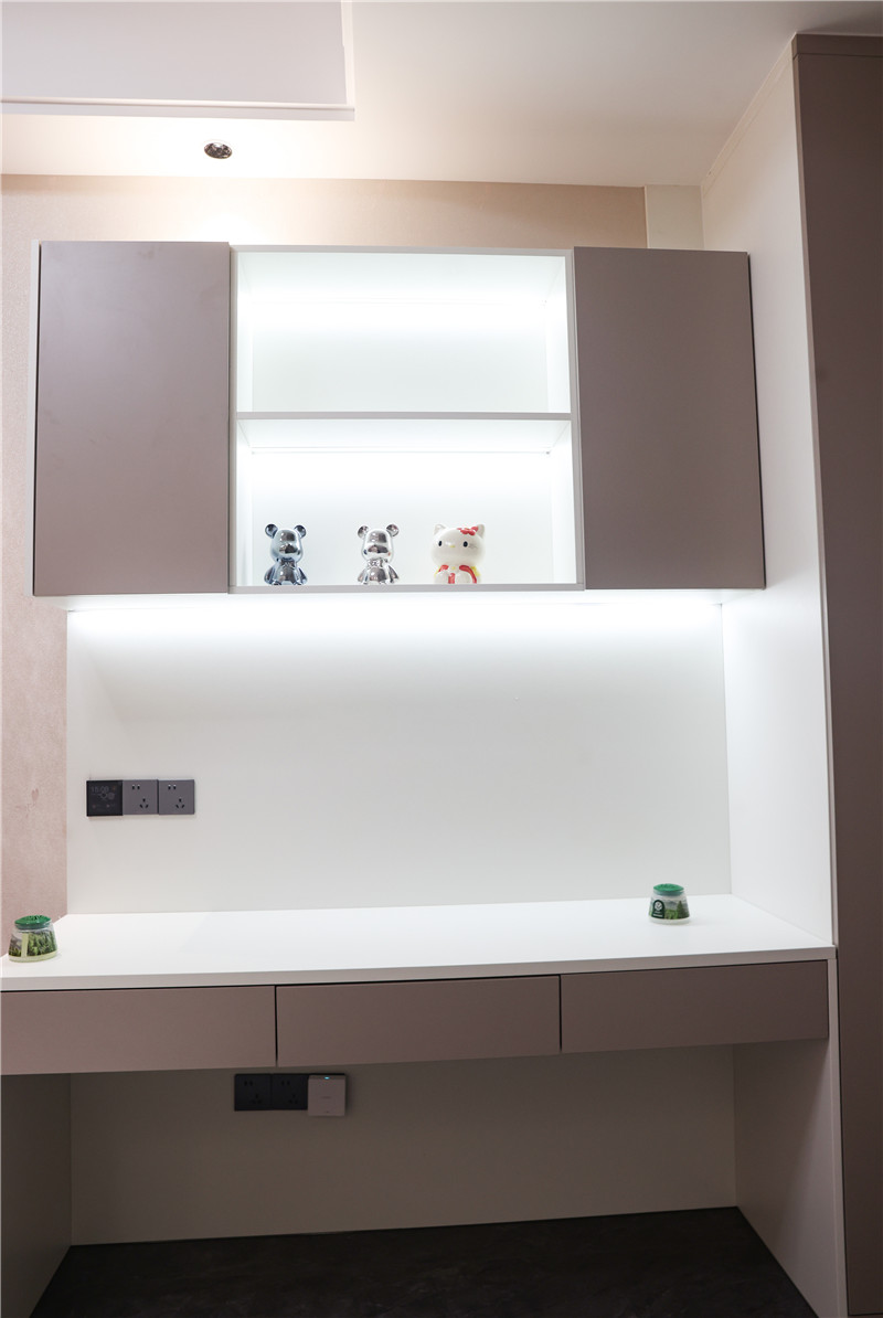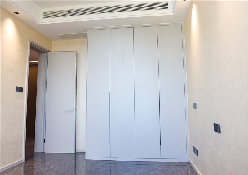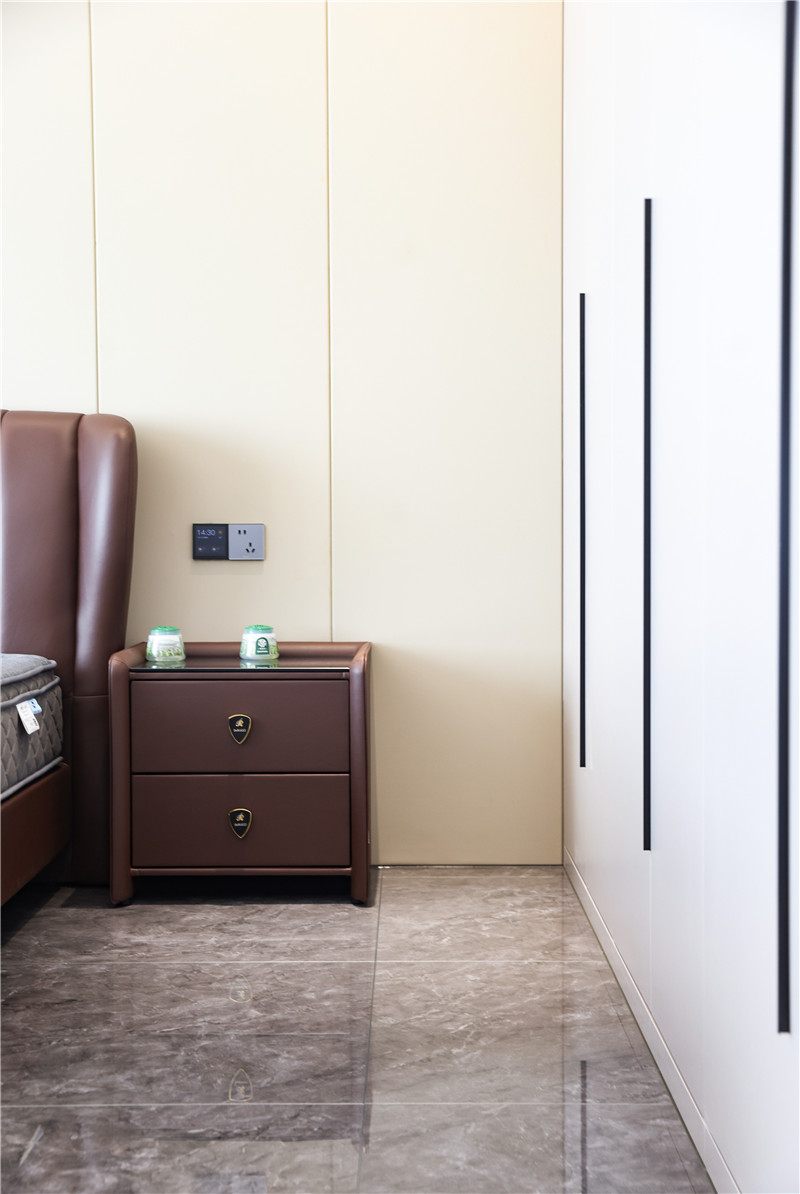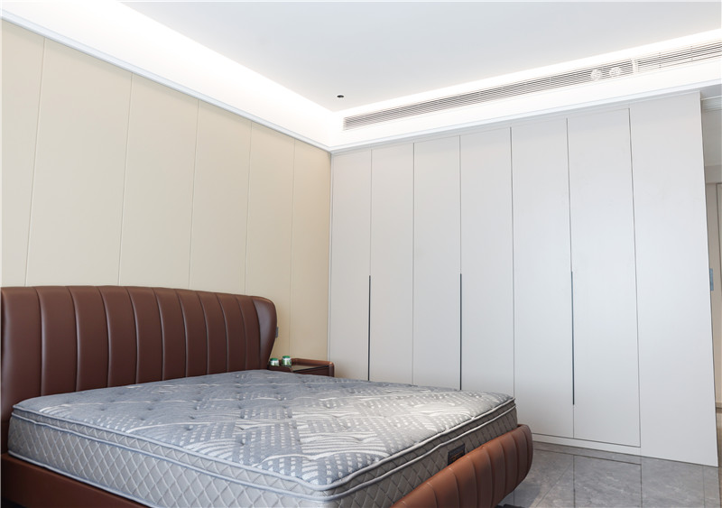 卧室简约流畅的线条设计与低调的配色,达成屋主想要的简单舒适氛围;一柜到顶式与一字型长条拉手简洁美观,无主灯设计使空间更加干净;部分留白让人充满遐想,在睡梦中遨游,感受舒适与自由。