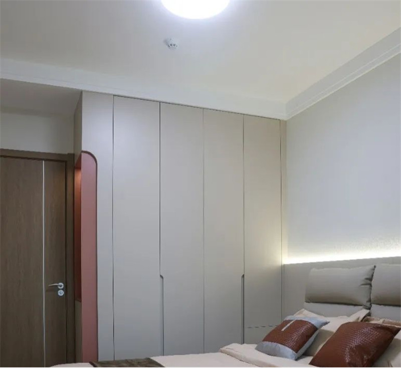 以实用为主要需求的卧室设计:简约的配色与简单的衣柜设计,一柜到顶式增加储物能力、半铣j型拉手简洁实用,其中跳色粉套格设计既时尚又具有一番创意,为舒适的空间带去一丝趣味。