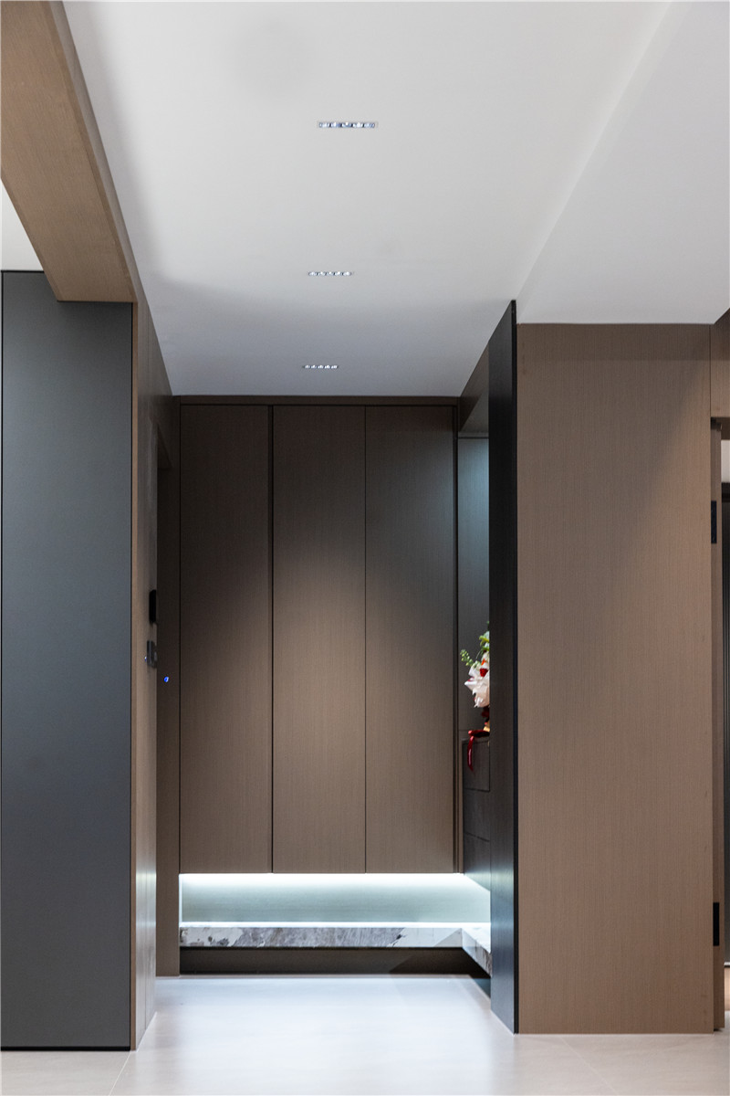 入门玄关整体L型构造,其悬浮掏空设计,显大且具深度;玄关造型采用内退手法,借用卧室空间来做DIY放置区;将条带灯光嵌入内退区拐角,明亮通透。