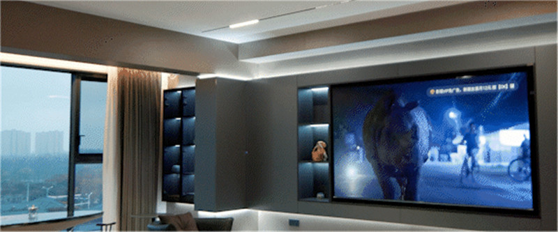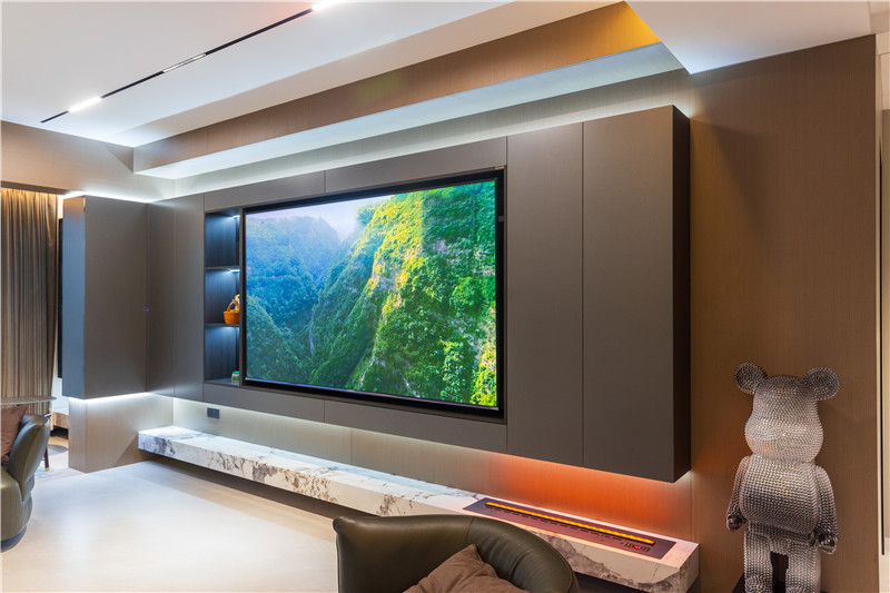 电视背景墙一体化设计,通过颜色穿插彰显个性化;电视机嵌入柜体中,与装饰隔层相协调,藏露结合;电视柜立体设计,墙内侧嵌入灯光,以氛围感突显层次感。