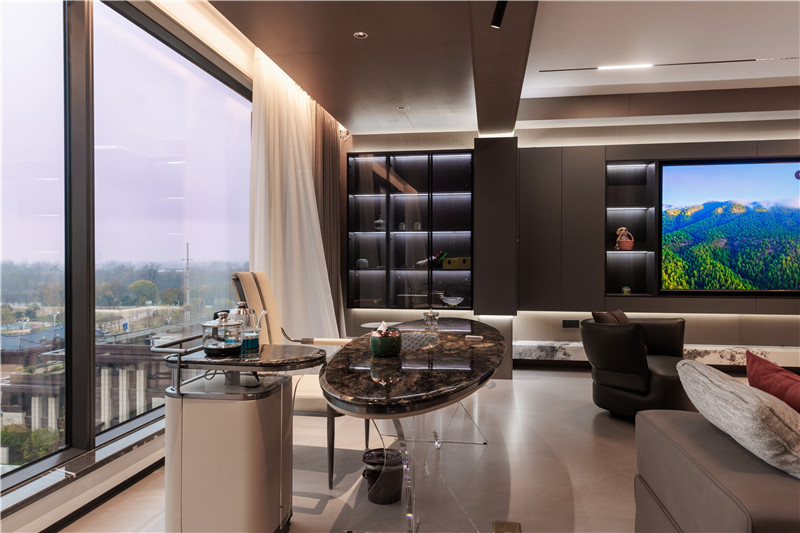 整屋科技直纹、睿智灰、黑木纹、茶白色拼接协调,突显全屋定制的魅力。