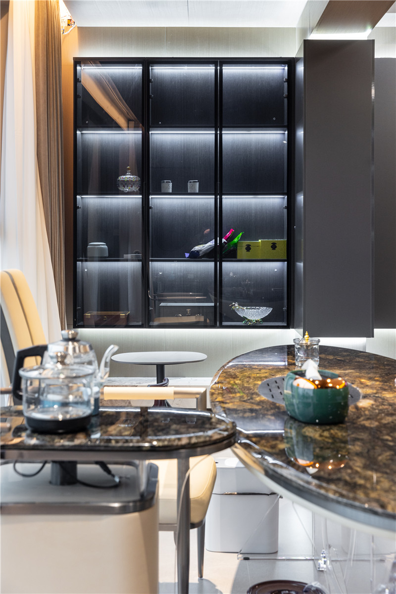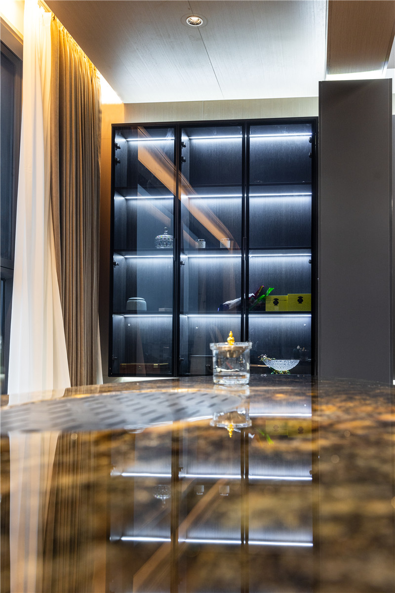 餐桌双圆弧造型,配合以整面餐边柜(中部掏空且预留轨道插座),木与玻璃的组合将收纳力有效保障。