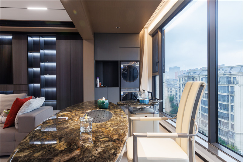 阳台整体加入独立式茶台,圆弧造型尽显高级感,沐浴阳光、品茶静思,真是一件美事。一侧小型洗衣房构造,分散家里的洗漱压力。