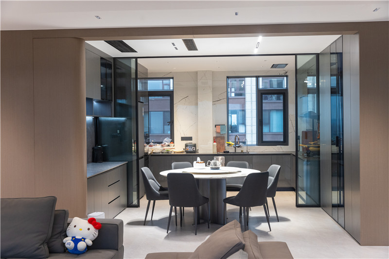 餐厨半开放式构造,以推拉门做隔断,兼顾美学与实用性。
