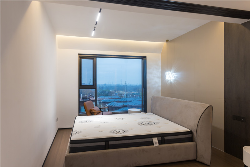 主卧床头背景墙采用拼接设计,艺术灯光做点缀,营造出简约纯粹感;靠窗吊顶为斜坡设计,视觉上拔高层高。