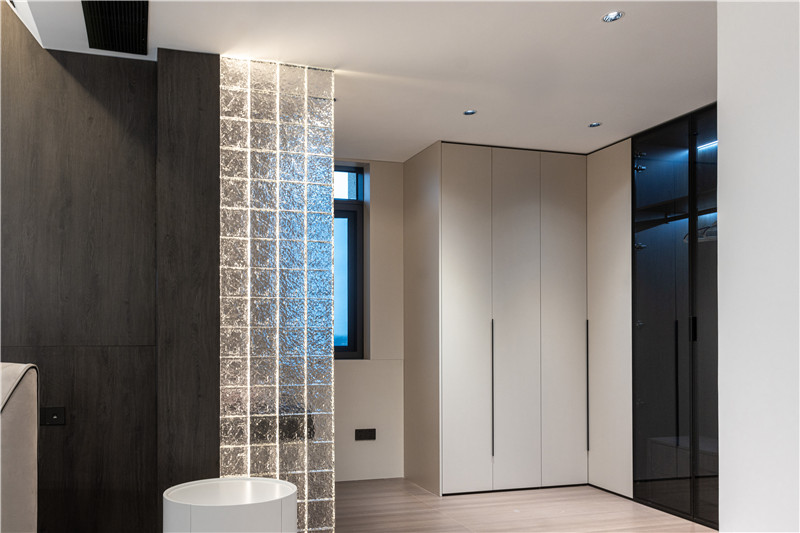 室内以梦幻玻璃砖隔出一个衣帽间,梳妆台依屋主需求定制高度,侧边U型立柜作为收纳区,展示区与私密区区分,符合人体工程学设计。