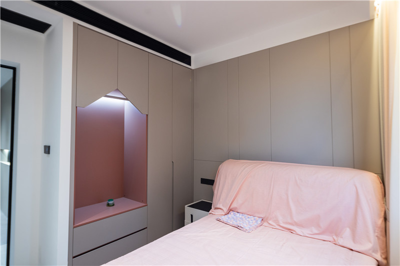 女儿房背景墙与衣柜一体化设计,中部做房屋造型并以粉色点缀,显活泼灵动,这样的温馨小屋太让人心动了吧~
