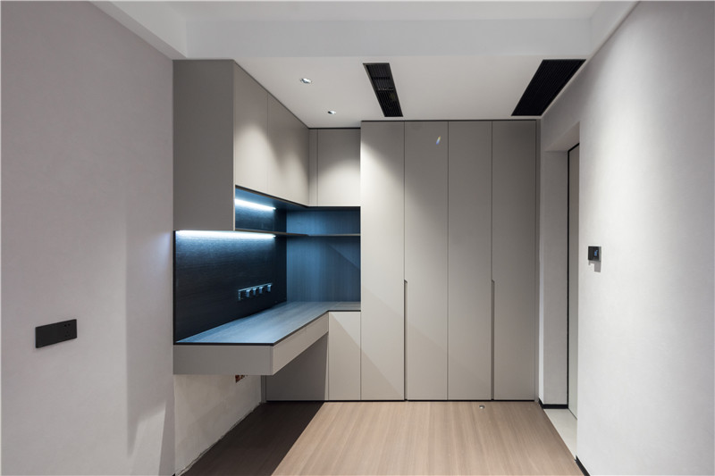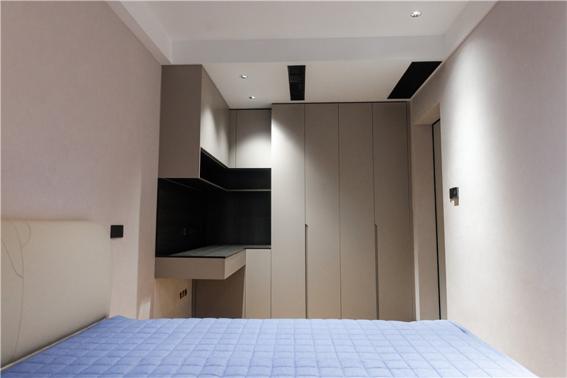 客卧兼书房使用,衣柜延伸为书桌,以悬挑设计突出特色。墙面采用了艺术漆,易擦拭,方便屋主整理清洁。