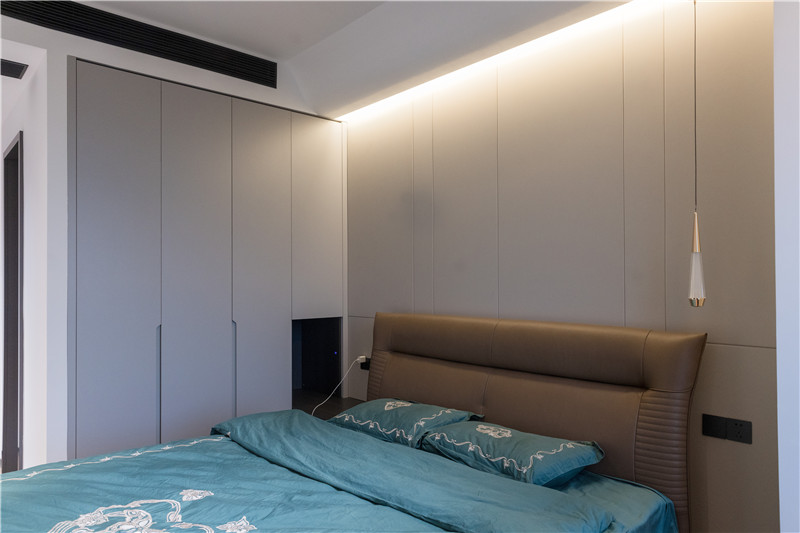壁柜有效保障收纳力、门板采用铣槽长拉手、柜体延伸为床头柜,简约实用;吊顶满满小心思,增强空间的光影感。