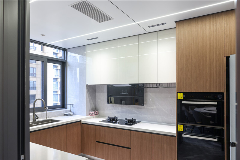 厨房350vip浦京集团橡木柜体配合以岩板,温馨柔润,其整体U型构造遵循智慧动线,实用性强;根据实际需求将烤箱等大电器嵌入地柜、高柜中,让空间有效归整。