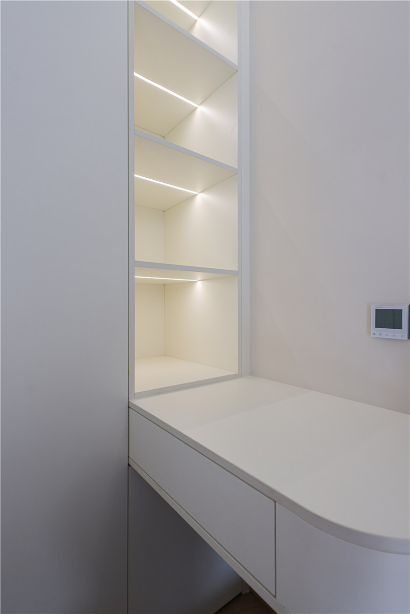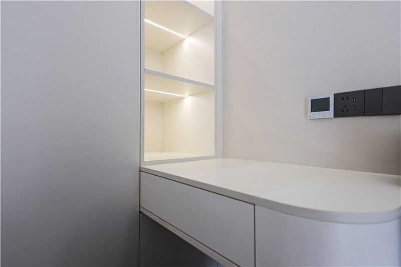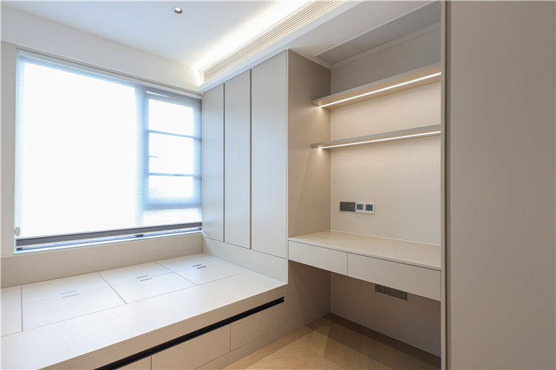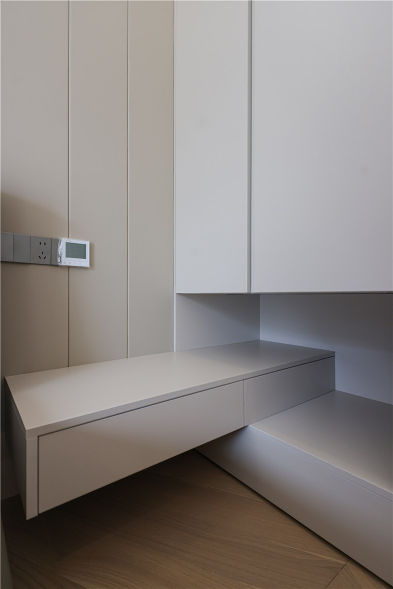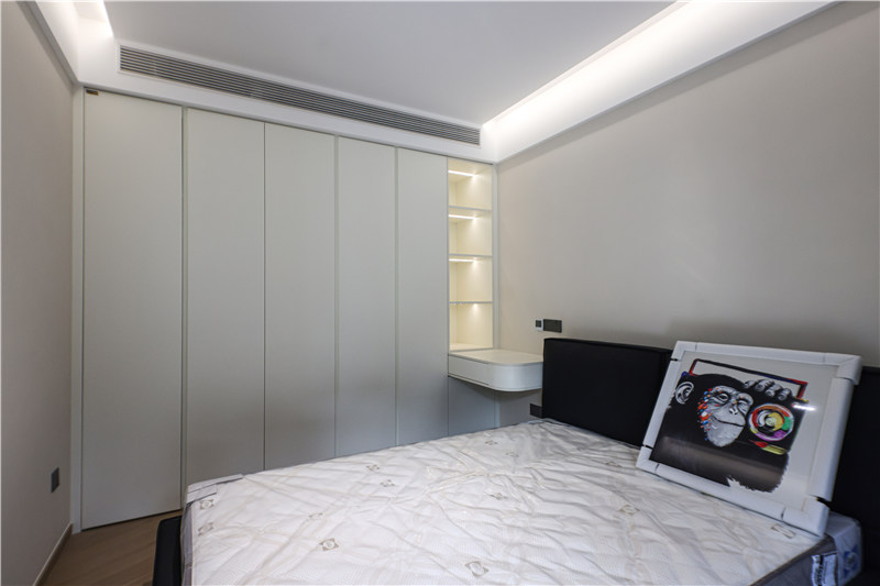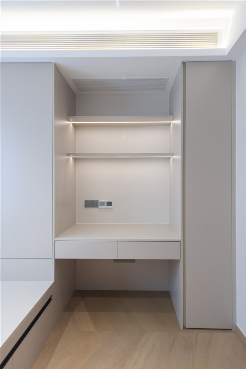 次卧为一体式设计,床、书桌、衣柜和谐统一,以铣槽及无拉手设计使得视觉清爽。