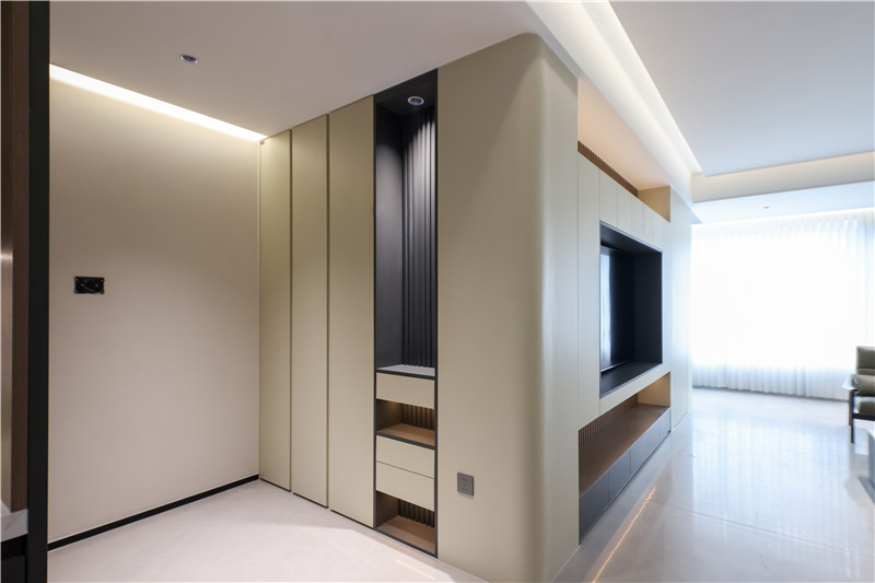 进门玄关柜与电视柜组合,连接处以圆弧收边,杏仁黄色调通铺展现高级柔和气质。玄关侧边高柜便捷挂衣,中侧穿插抽屉、背板跳色配合以栅格造型,彰显个性化美感。