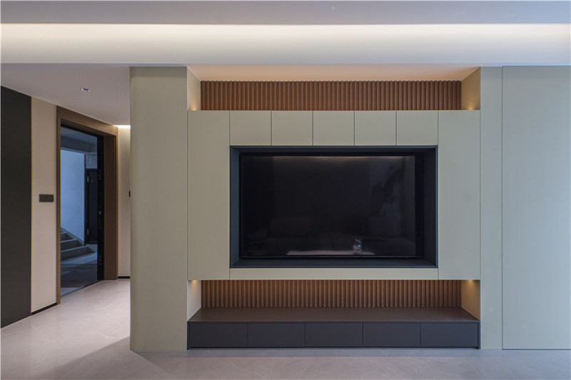 电视柜以木色格栅及辅助灯光建立层次感,电视机内嵌、灰调一字型底柜视觉加深,主次分明;沙发背景墙为拼接式设计,大理石花纹、水漆背景墙、纵向格栅衔接,好看雅致。