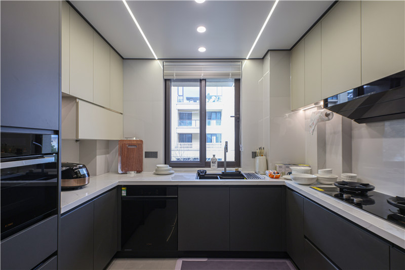 厨房U型构造,以洗切烹盛动线提升烹饪效率,台面岩板材质耐磨耐刮防渗水。