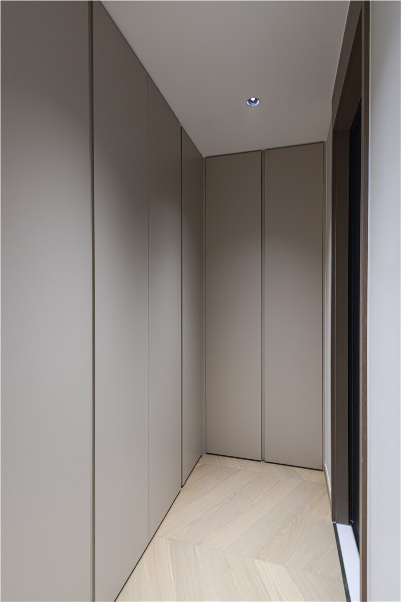 主卧进门一字型无拉手到顶柜延伸以床头柜,区别于对侧柱形柜,茶白色柔和雅致。