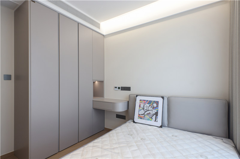 女孩房整体无主灯设计,打造出温馨柔和的氛围感;衣柜呼应于男孩房设计,兰迪米灰色低调且不失质感,床头柜上下方预留插座,方便实用。