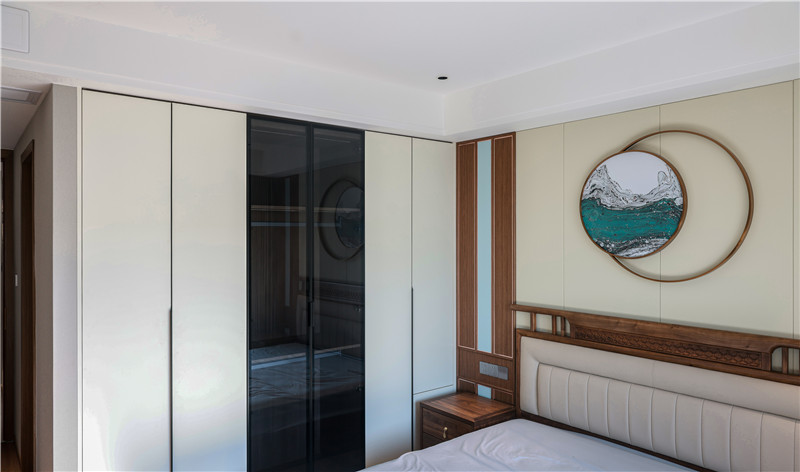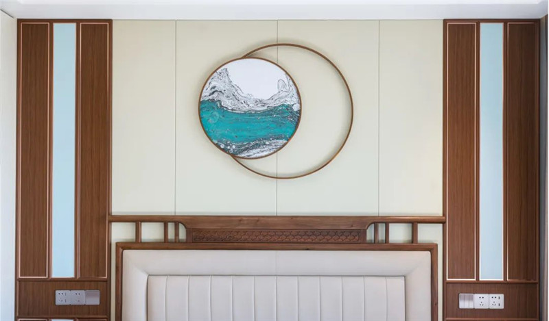 背景墙采用不规则拼接,实木与米白的配色经典和谐。背景墙中遵循了中式美学对称,简中有序,整个卧室洋溢着新中式意境。
