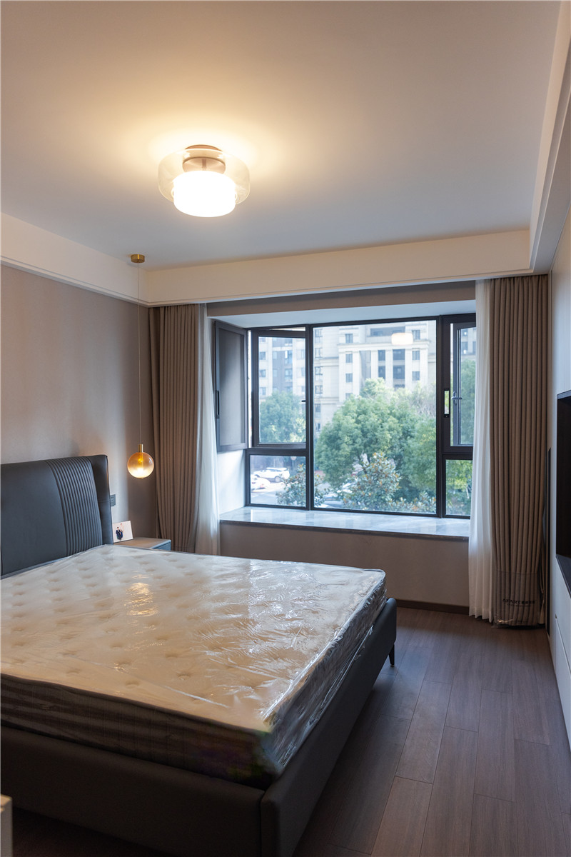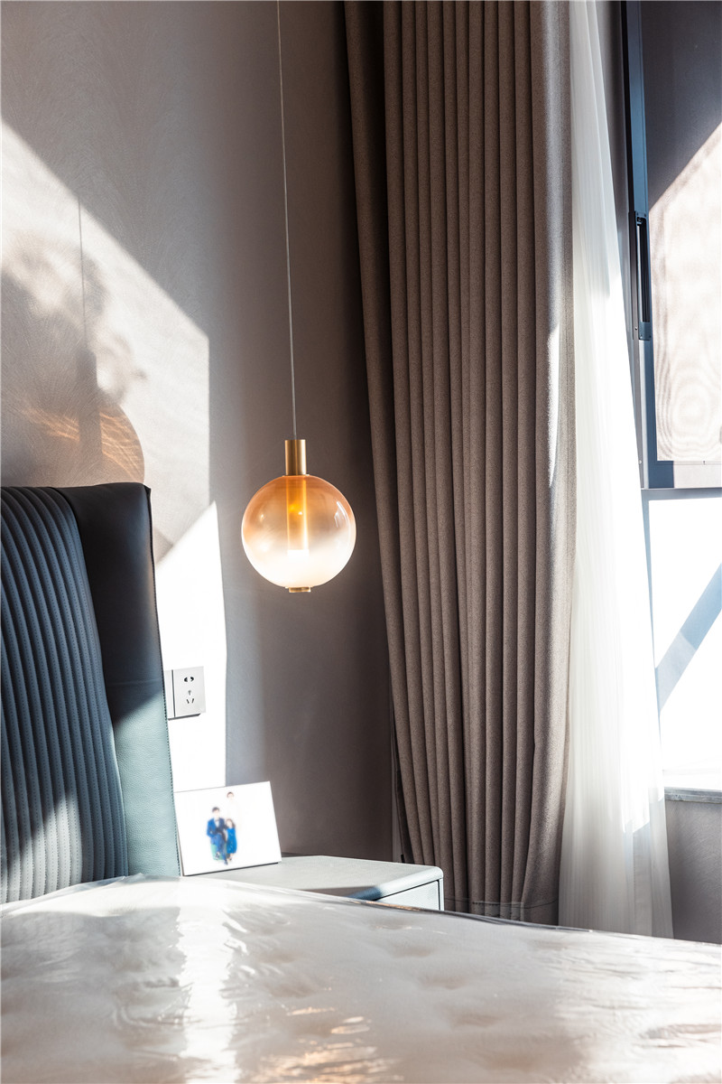 主卧水漆茶白与蓝咖啡色配合,低调沉稳且不失新意;整体主灯与艺术床头灯配合,满足日常起居需求;双窗帘透光不透人,居家更安全。