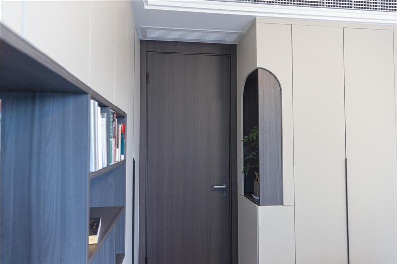 主卧进门立柜以黑色简约长拉手突显线条感,侧边圆弧造景展现高定气质,内部挂叠结合式设计满足多种收纳需求。
