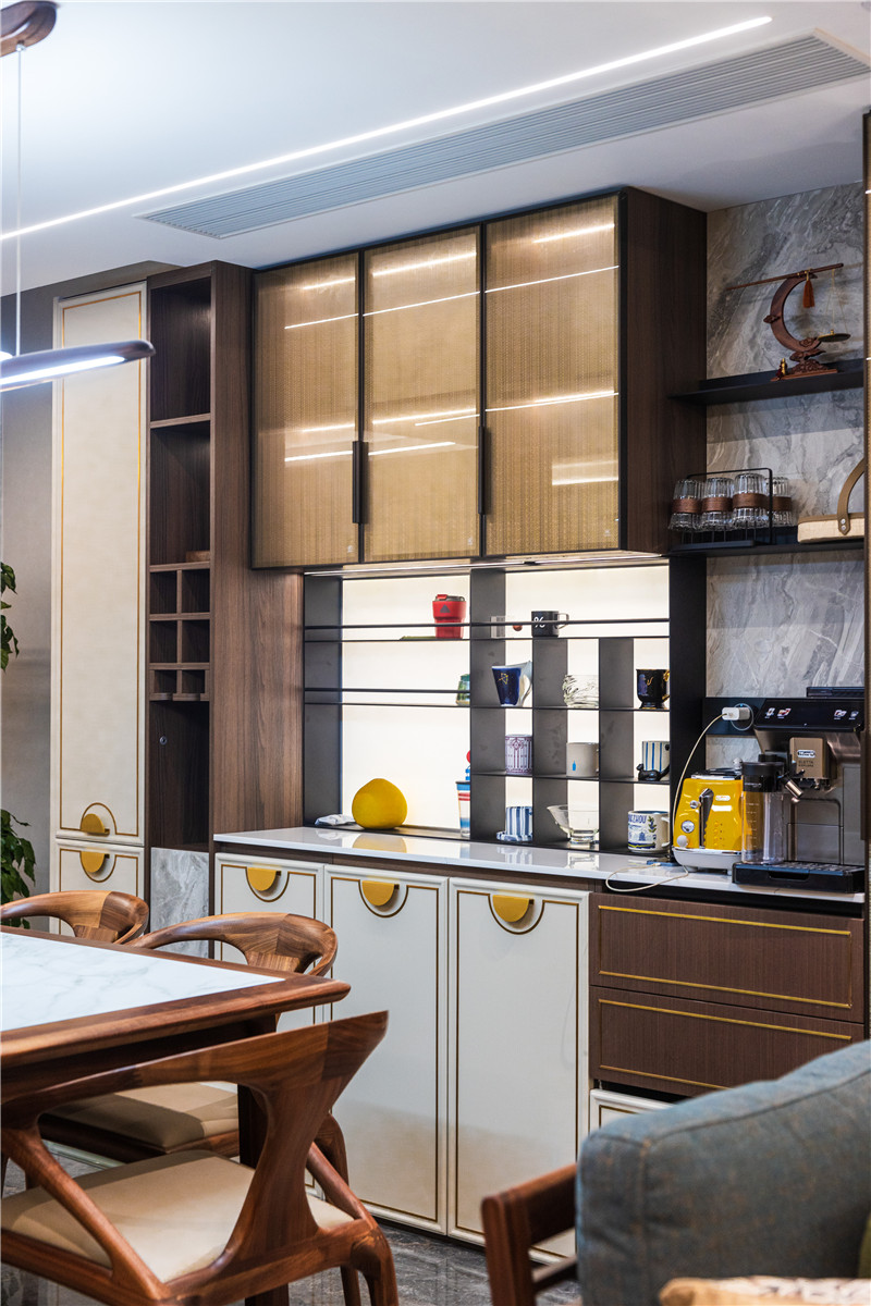 餐厨空间整体为开放式构造,烹饪与用餐动线明晰,方便家庭成员共同参与其中;餐厨空间协调于整屋新中式装修,主灯与辅灯结合式设计,空间敞亮。