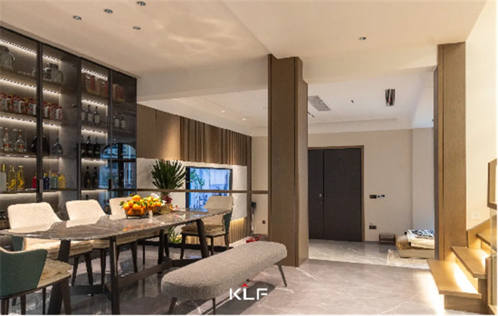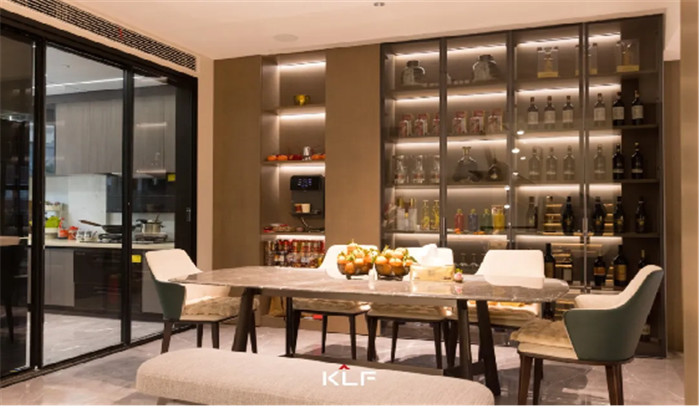 开放式层板带灯透出轻奢奢品质感,让整体空间看起来更加立体,将开放收纳格打造成收藏天地,轻松满足纵横四海,以酒为友的场景需求。