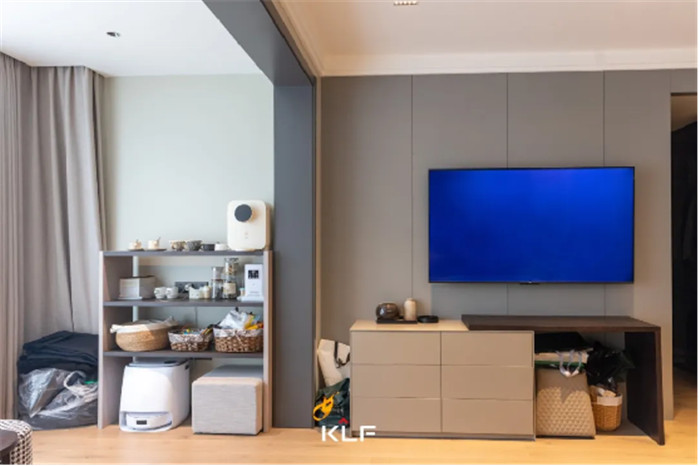 满墙格栅设计增加舒适感,缓和轻奢风带来的疏离,让空间更加和谐宜居,客厅无主灯设计让空间更加宽阔明亮。
