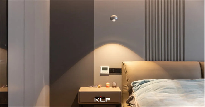 卧室设计整体风格温馨舒适,空间色系更加温和;无主灯设计使得屋内简约开阔;床头背景墙拼接+格栅,时尚又充满设计感。