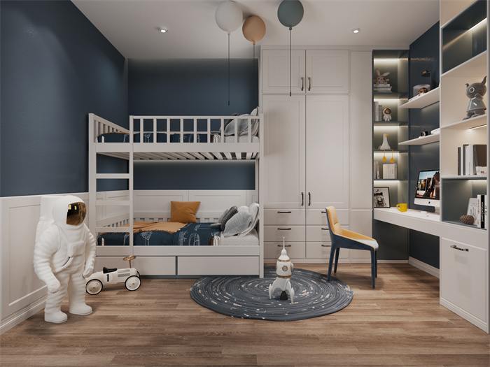 儿童房空间延伸了设计的⾊彩主题,不同饱和度的蓝色配合深邃的星空蓝,冷静并充满思考,L形的设计也被充分利用。