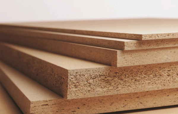 由木材或木杆,原木打碎,两边使用细密木纤维,中间夹长质木纤维,施加胶粘剂后在热力和压力作用下胶合成的人造板,俗称刨花板,简而言之就是,颗粒板=木碎料+胶。