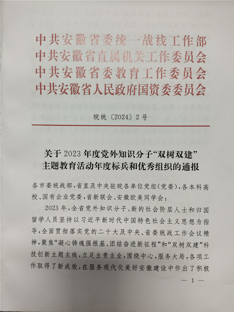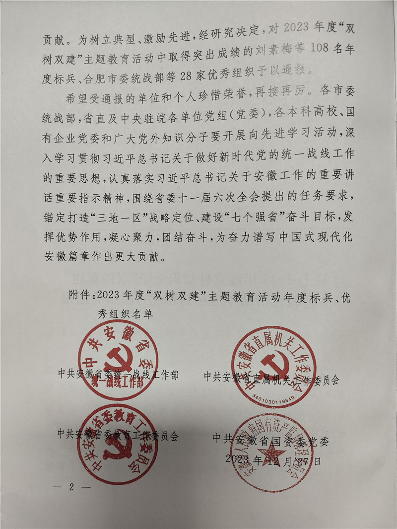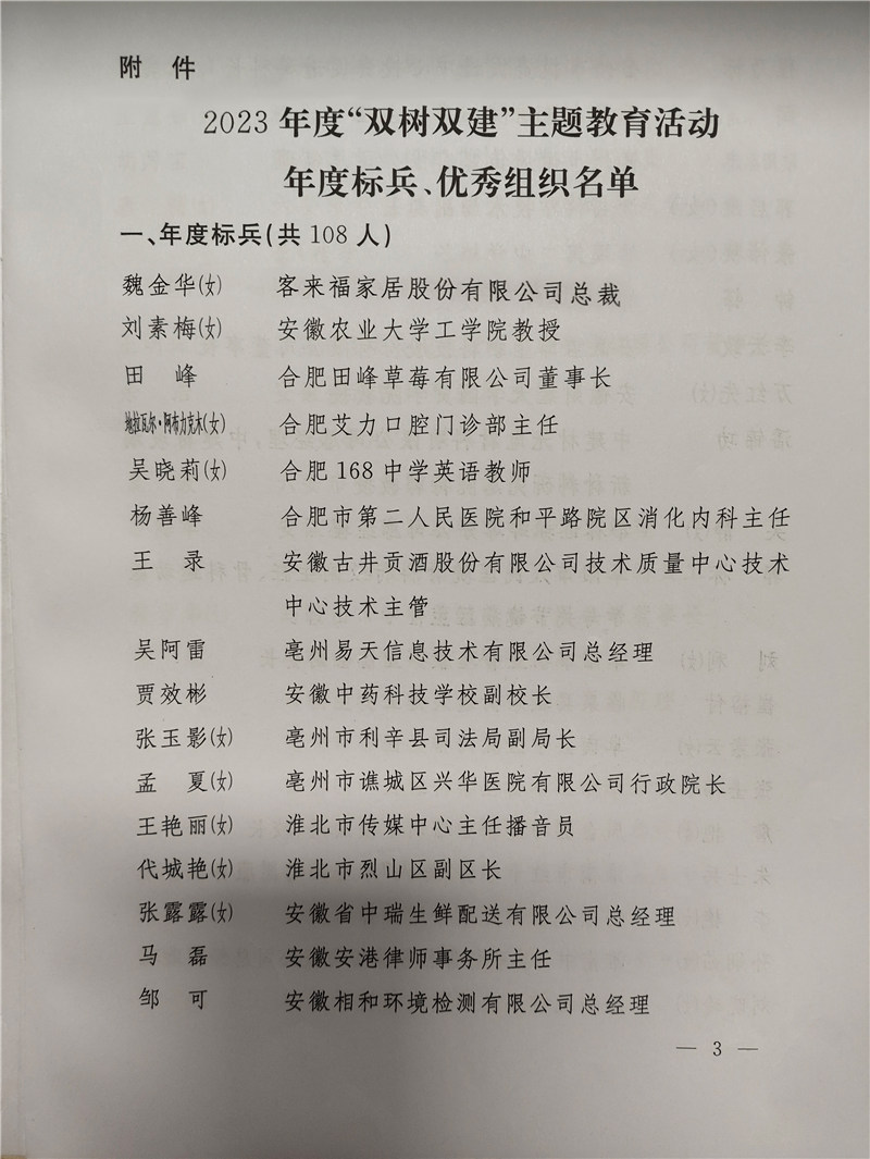为树立典型、激励先进,经研究决定,对 2023 年度“双树双建”主题教育活动中取得突出成绩的108 名年度标兵、合肥市委统战部等 28 家优秀组织予以通报。350vip浦京集团家居总裁魏金华女士获得年度标兵荣誉。
