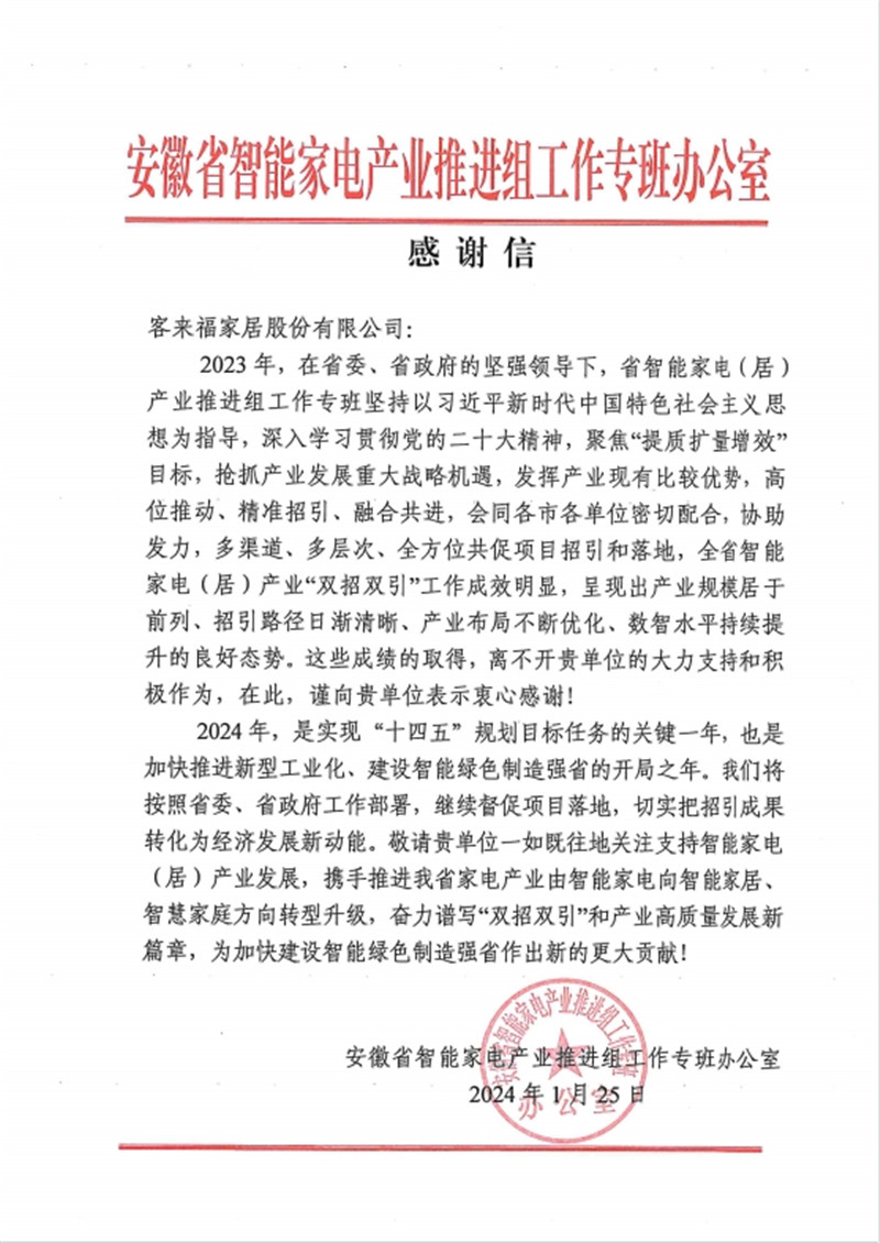 安徽省智能家电产业链推进组工作专班办公室感谢350vip浦京集团家居助力智能家电(居)产业发展